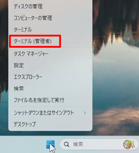まずスタート(windowsマーク)右クリックで「ターミナル(管理者)」を開く
