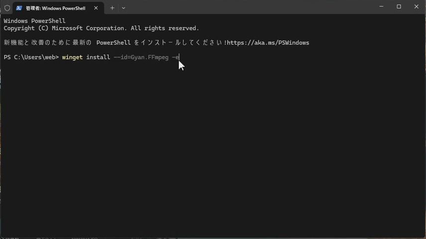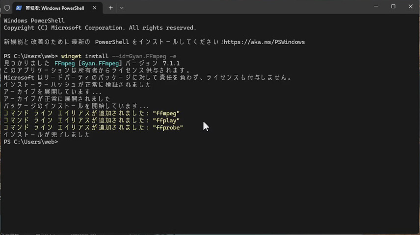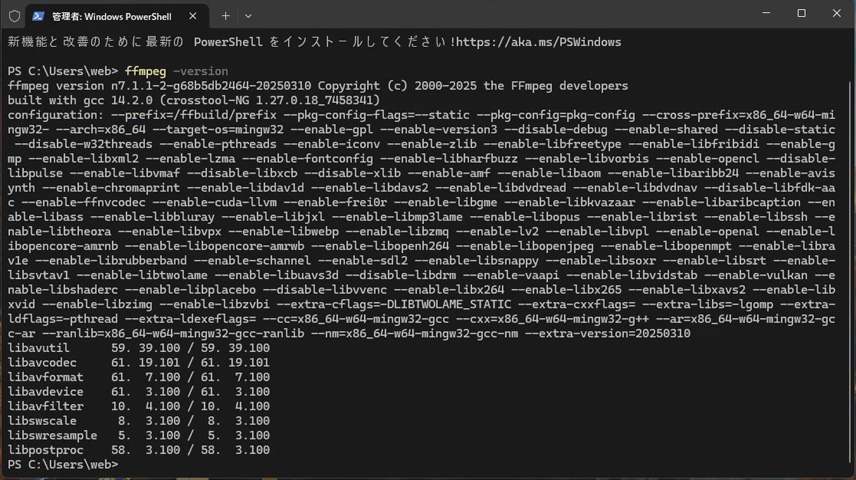上記方法でうまくいかなかった人は「FFmpeg windows」ググると他の方法も出てくるので調べるとよい。