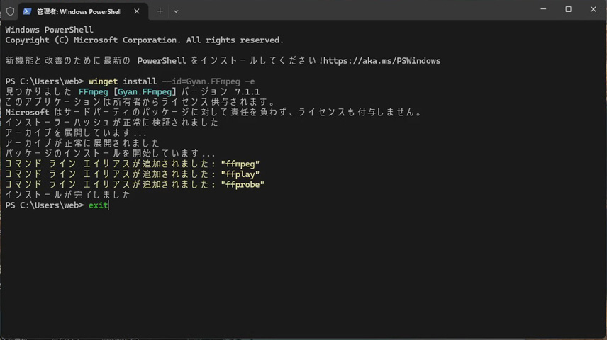 インストール完了後に「exit」と入力してenterで一旦ウインドウを閉じる。
