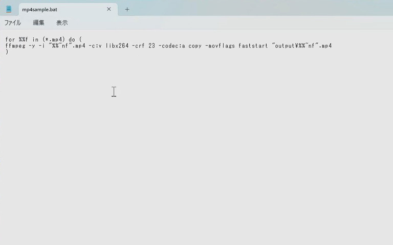 「ffmpeg -y -i "%%~nf".mp4」のところと「ffmpeg -y -i "%%~nf".mp4」(2個所)のところのmp4を書き換えれば他の形式からの変換も可能