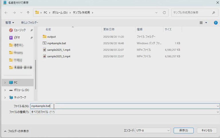 「名前を付けて保存」、ファイル名「〇〇〇.bat」、ファイルの種類「すべてのファイル」で変換元動画ファイルと同じフォルダに保存