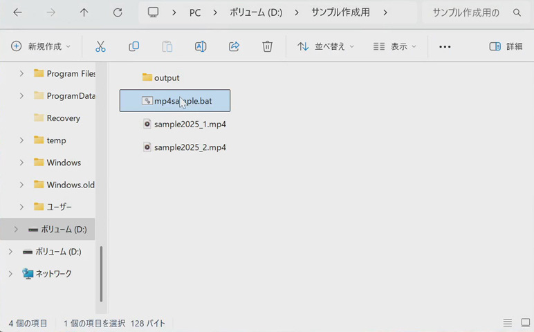 任意のフォルダに変換したいmp4動画ファイル(複数でも可)を入れ同フォルダ内に「output」フォルダを作っておく。